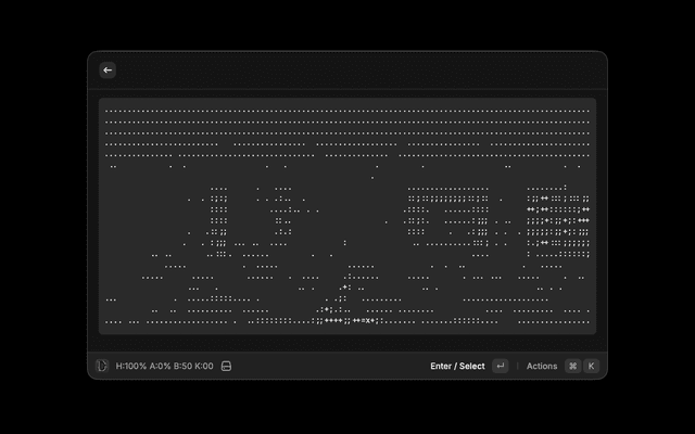 • Display Resolution: The game renders at 106x20 character resolution in ASCII format to fit within Raycast's text-based display environment.