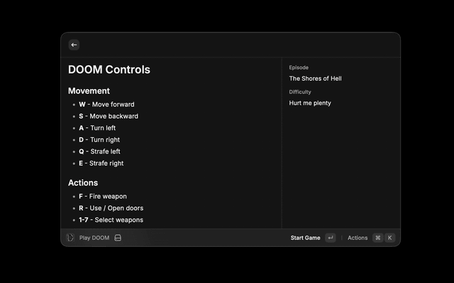 Note: The ESC key opens DOOM's in-game pause menu (standard DOOM behavior). To fully stop the game and release WASM resources, use Cmd+Shift+Q or select "Stop Game" from the Action Panel.